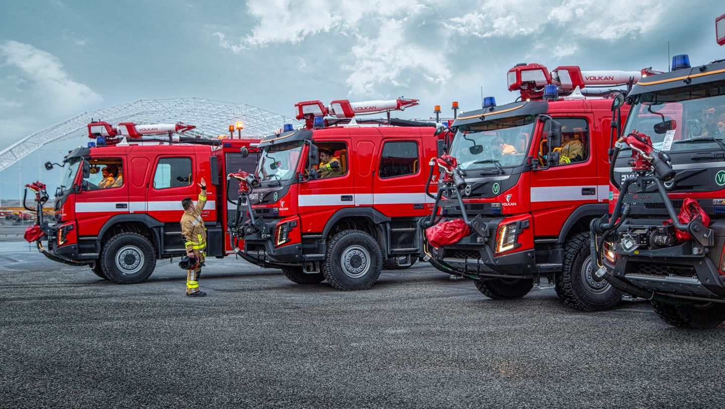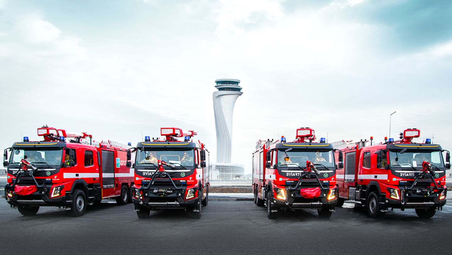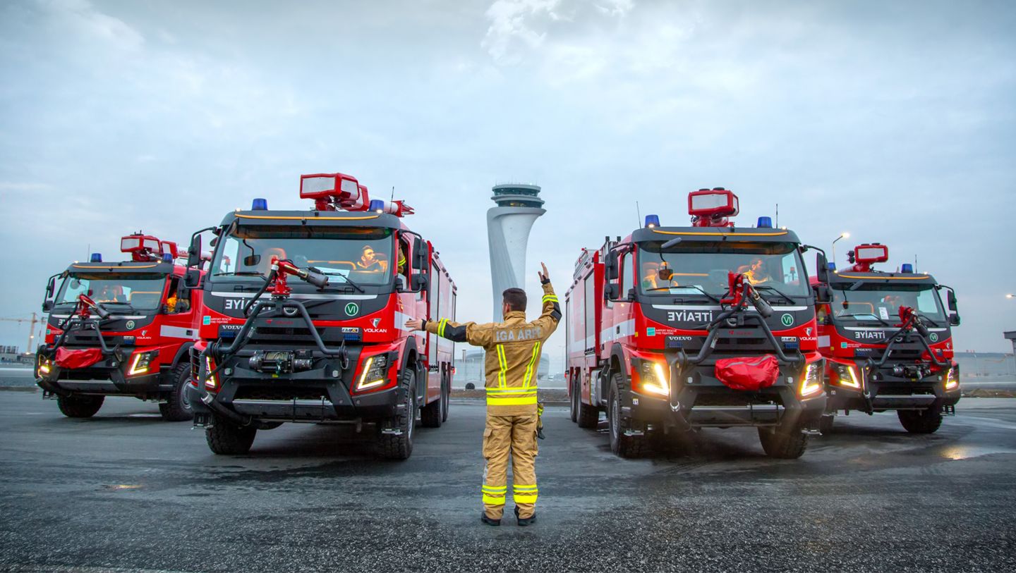 Araçların, İstanbul Havalimanı’nda uçuş ve yer emniyetinin sarsılmaz koruyucusu Havaalanı İtfaiyesi – Aircraft Rescue Fire Fighting (ARFF) ekibinin uçak, bina ve tesis yangınlarında kullanımı için alındığını belirten İGA Hava Tarafı Operasyon Direktörü Ozan Karakış, “Havaalanlarında meydana gelen hava aracı kaza kırım ve yangın olaylarına müdahale süresi çok kritik bir kriterdir. İhbarın alınmasından itibaren 3 dakika içerisinde müdahale edilmesi zorunludur. Araçların taşıdığı yüksek miktardaki su ve yangın söndürme köpüğü, olayların kaplamalı yüzeyler dışında arazi şartlarında da meydana gelebilecek olması, aracın çok kısa sürede azami hıza çıkmasını ve arazi şartlarına uygun olmasını gerektirmektedir. Bu bağlamda Volvo Trucks tarafından sağlanan araçlar tüm şartları başarı ile karşıladığı için tercih sebebi olmuştur.” diyerek konunun önemine dikkat çekti.